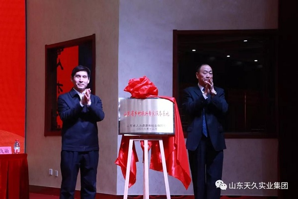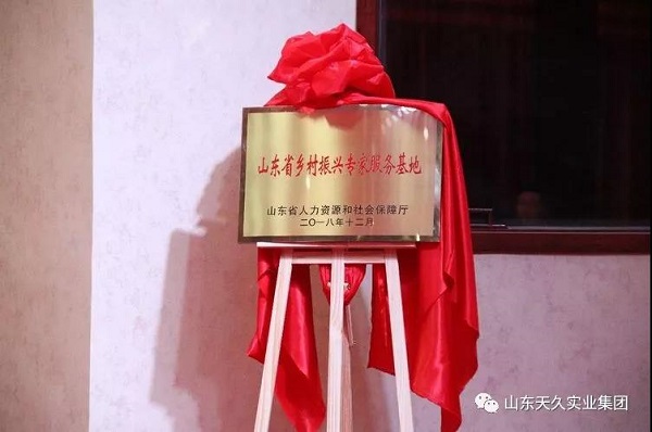 菏泽市委常委、常务副市长王磊与天久集团董事长张九勋为全省首家我市唯一一家乡村振兴专家服务基地揭牌。